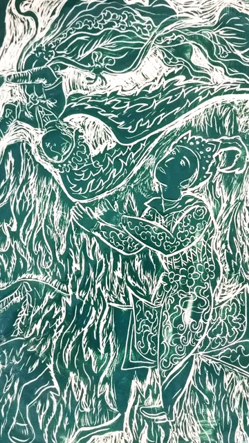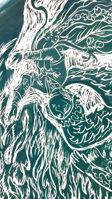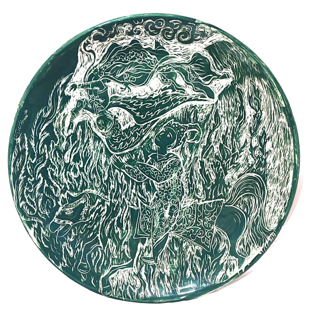در مرکز این بشقاب سرامیکی، یکی از حماسیترین صحنههای اساطیر ایران نقش بسته است: این نگاره تنها یک تزیین سرامیکی نیست، بلکه دریچهای است به دنیای نمادها و روایتهایی که قرنها در خاطره جمعی ایرانیان زنده ماندهاند.